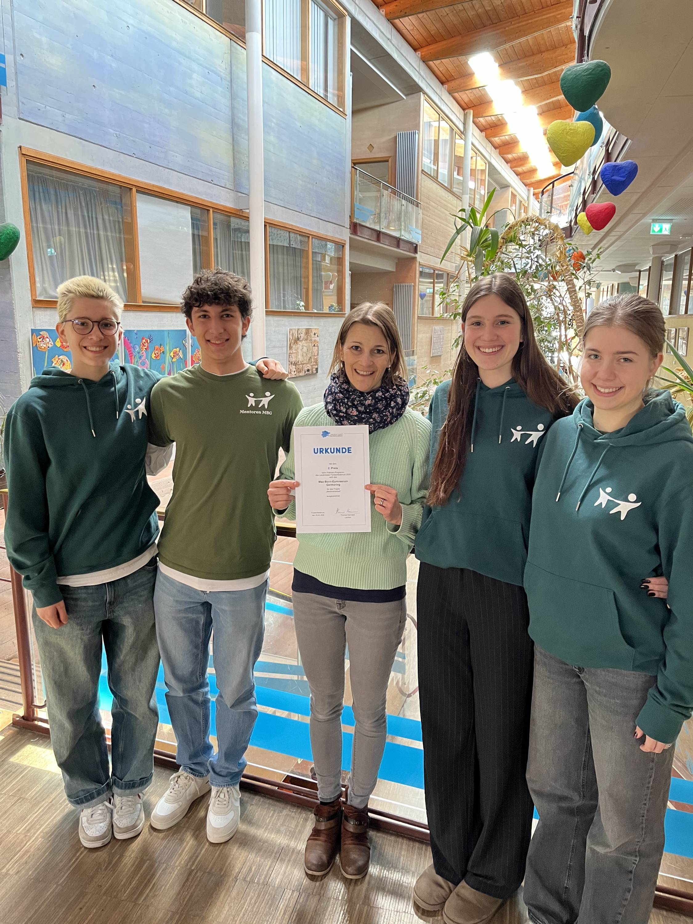 Unsere Mentorinnen und Mentoren wurden mit einem 2. Preis beim Prämienprogramm des Landkreises Fürstenfeldbruck ausgezeichnet. Die Mentorenleitung, Louise, Ioannis, Sophia und Selina (v.l.) nahmen den Preis mit ihrer betreuenden Lehrkraft, Frau Straub, stellvertretend entgegen.