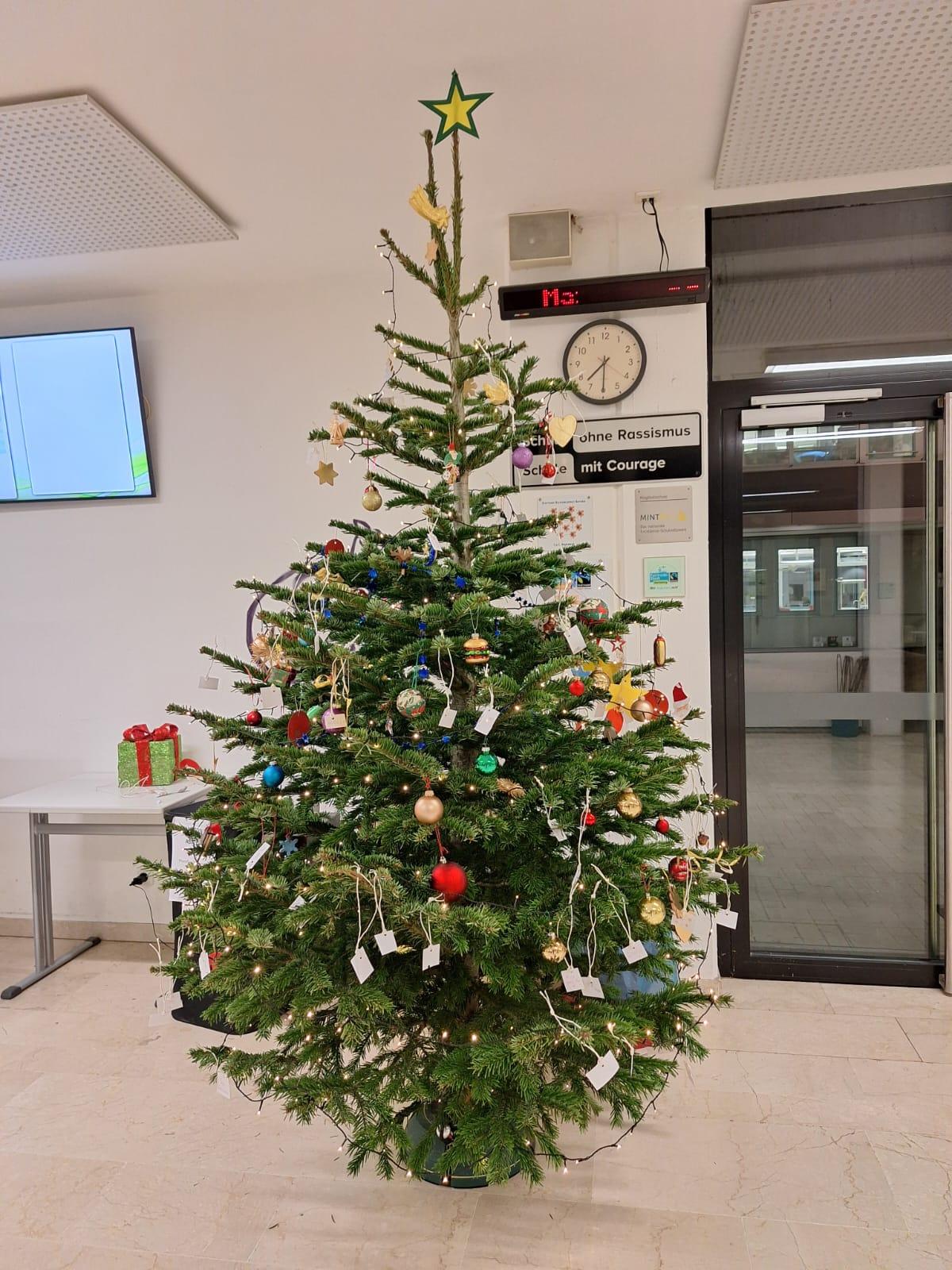 Mit viel Liebe von unseren Schülerinnen und Schülern dekoriert, wird er zugleich zum „Wunschbaum“ für die Weihnachtsaktion der SMV.