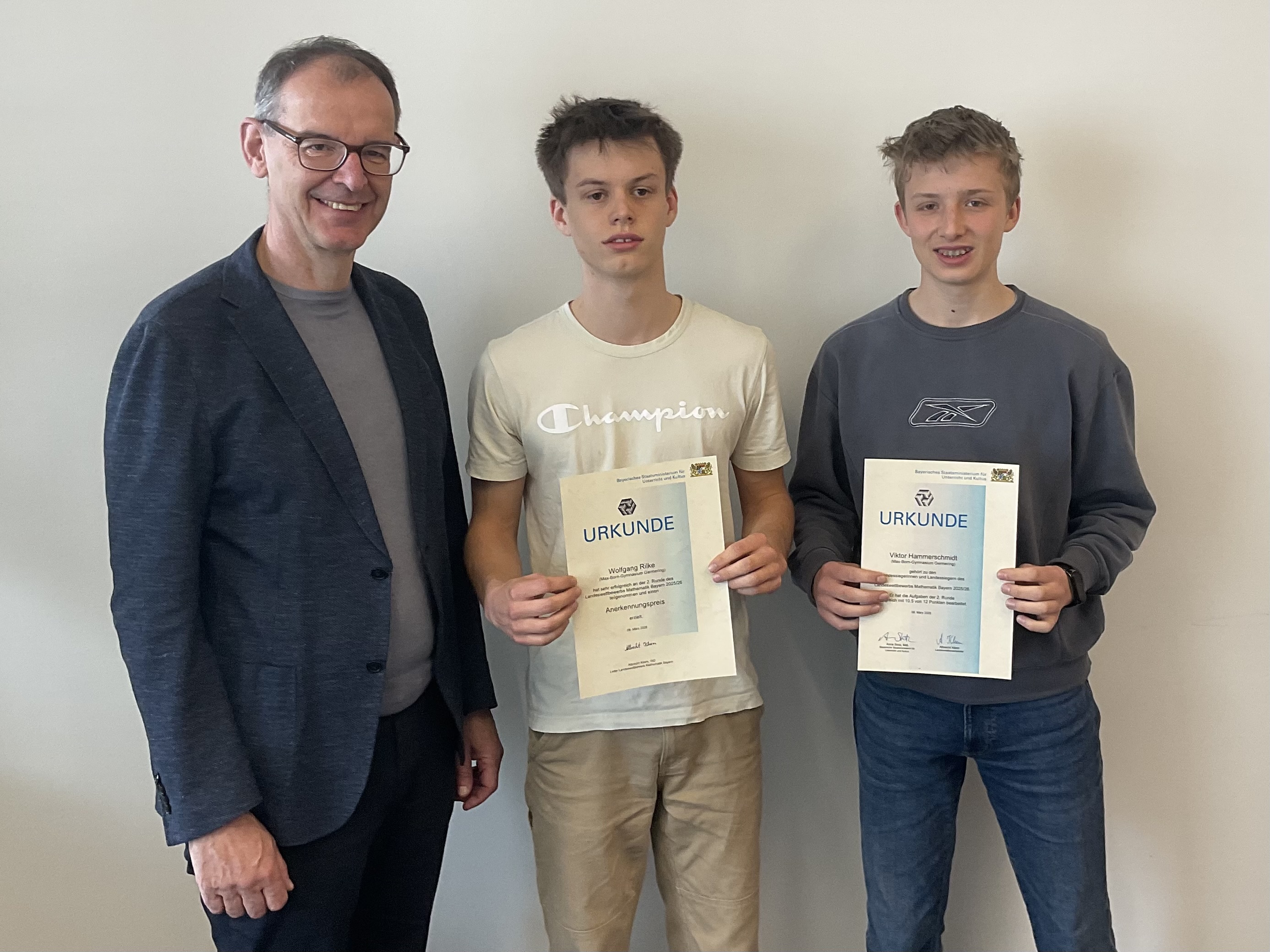 Wolfgang Rilke (10a) und Viktor Hammerschmidt (10c) haben in diesem Jahr beim Landeswettbewerb Mathematik die zweite Runde erreicht und dabei beachtliche Erfolge erzielt: Wolfgang erzielte 8,5 von 12 Punkten und zählt damit zu den besten 125 von über 1000 Wettbewerbsteilnehmenden. Für seine starke Leistung wurde er mit einer Urkunde ausgezeichnet.
