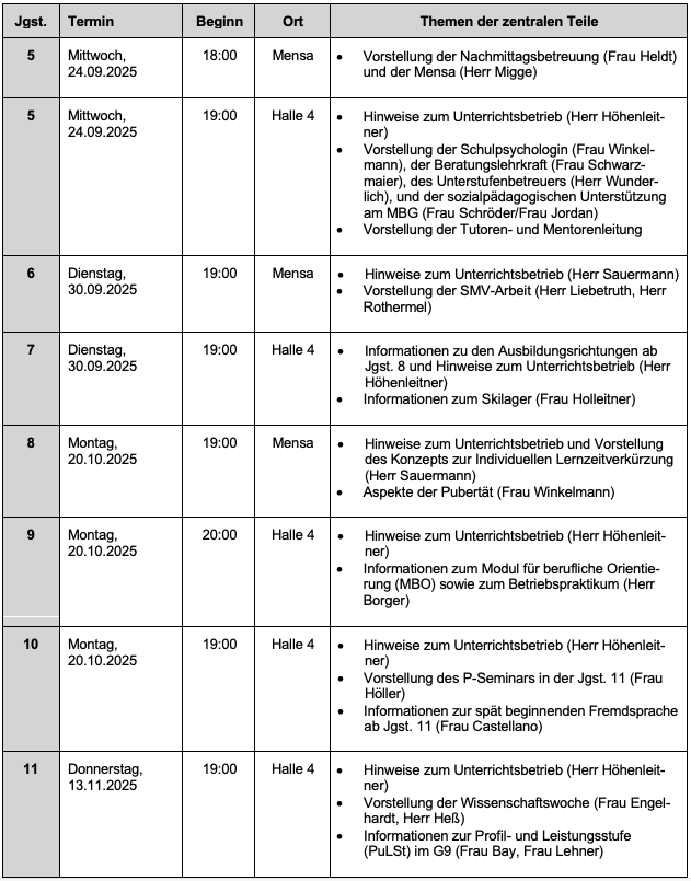 Eine Übersicht über die Klassenelternabende im Schuljahr 2025/26 finden Sie nachstehend: